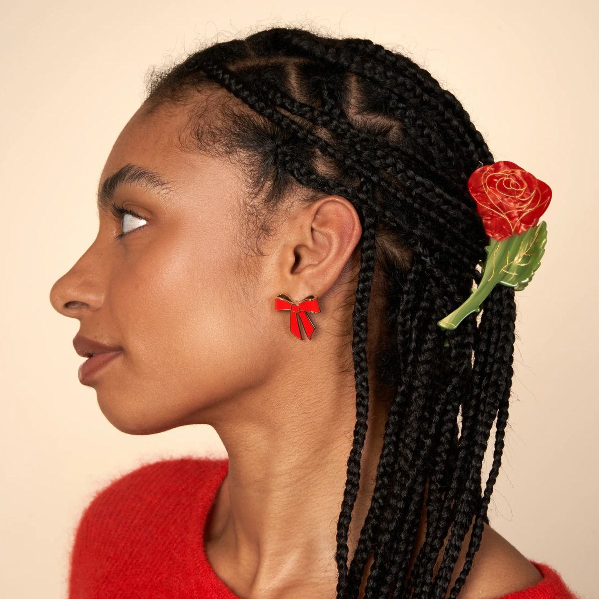 Nella famiglia dei fiori, noi scegliamo la rosa! Una splendida molletta a forma di rosa appena colta, completa di spine e petali rosso intenso. Un vero piccolo gioiello che risalta su qualsiasi acconciatura e rappresenta il regalo perfetto per San Valentino!