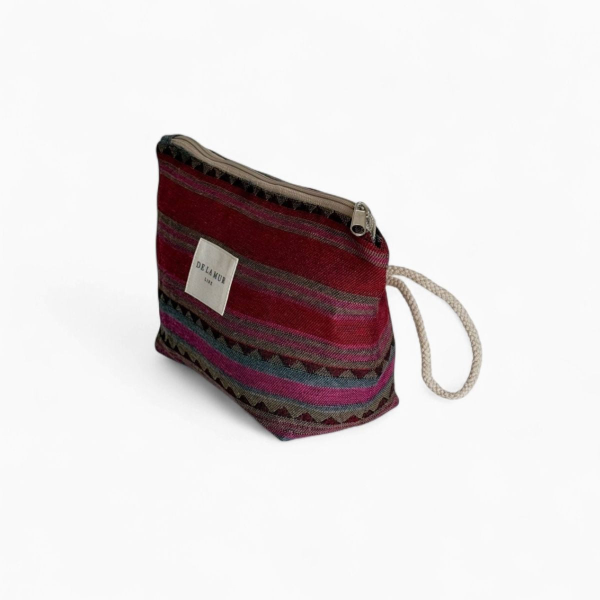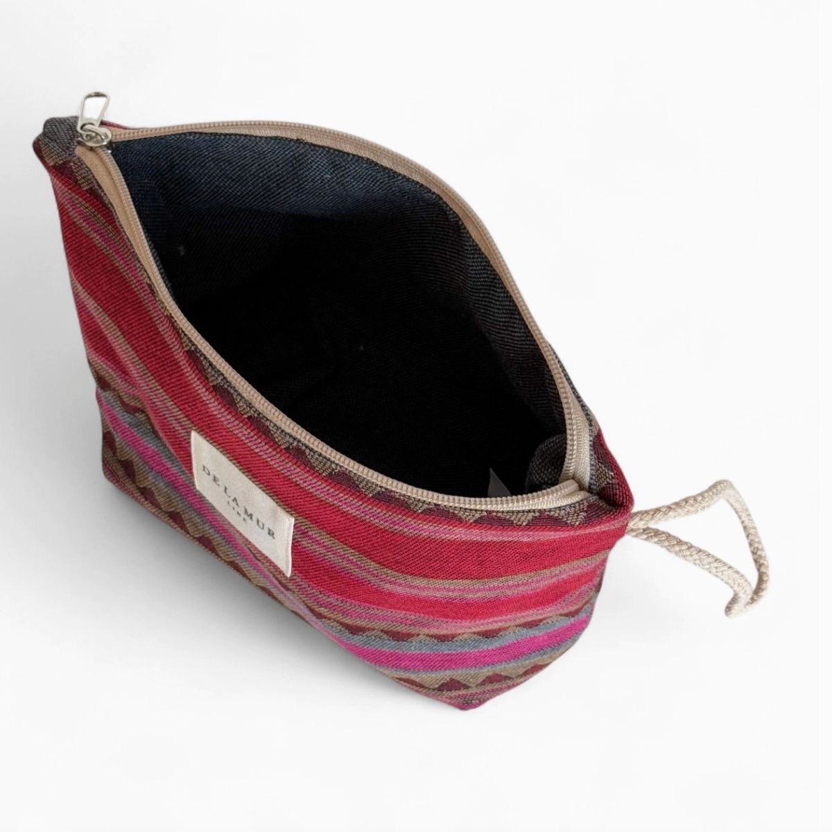 Beauty case medio con cerniera nella parte superiore e manico in corda beige sul lato.