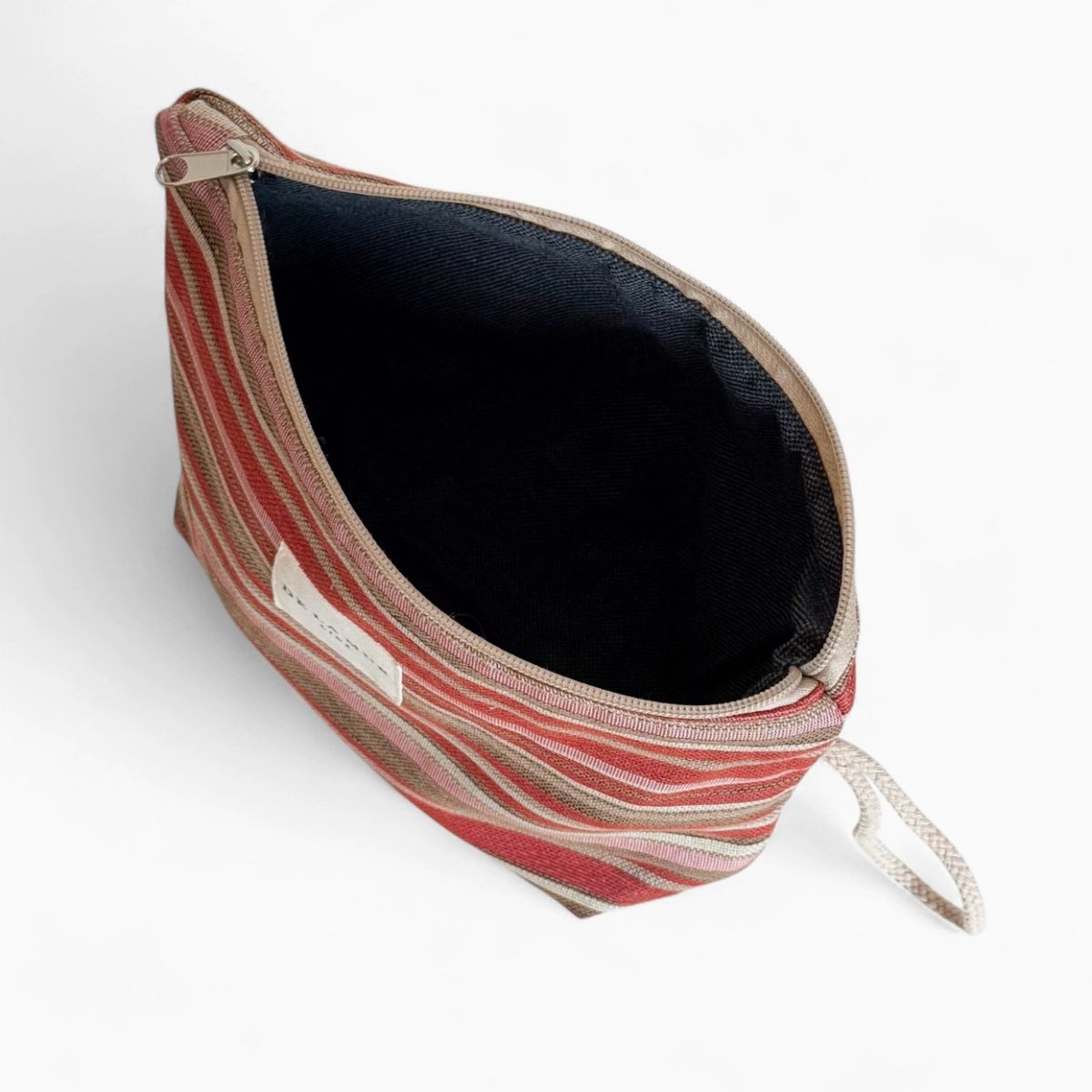 Beauty case con cerniera nella parte superiore e manico in corda beige sul lato.