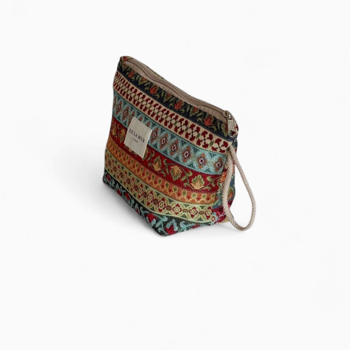 Beauty case con cerniera nella parte superiore e manico in corda beige sul lato.