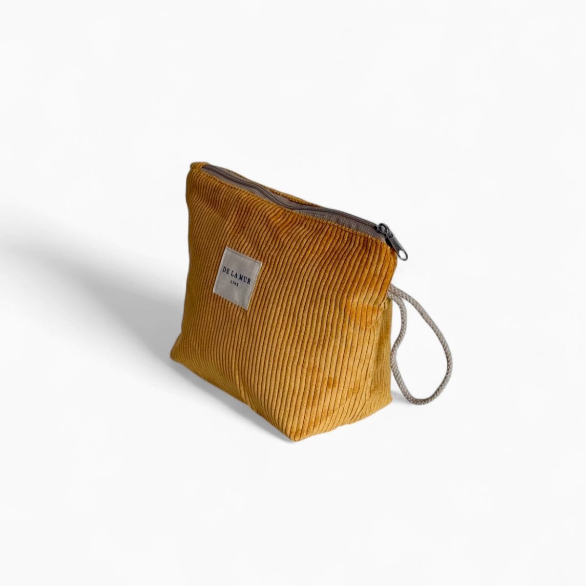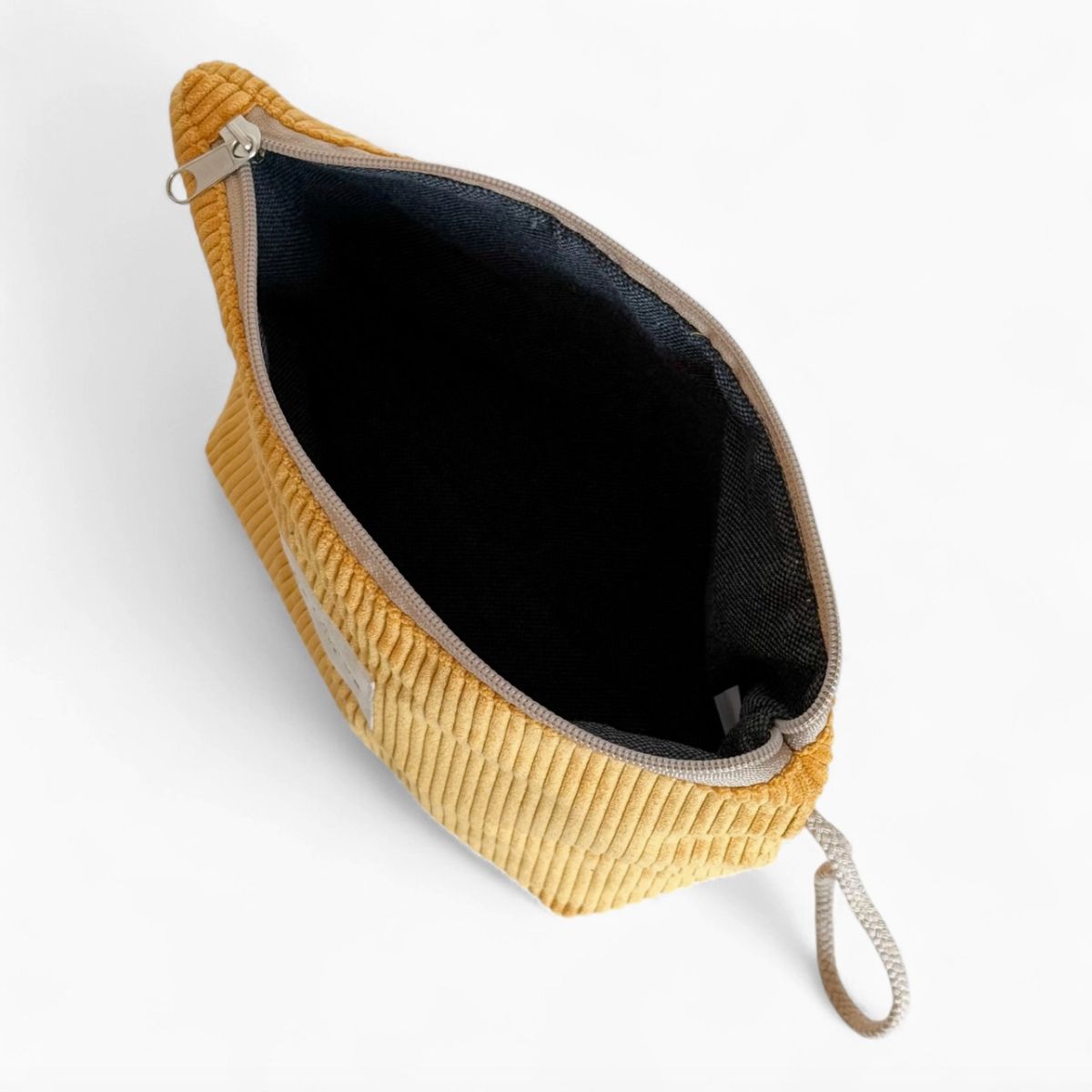 Beauty case con cerniera nella parte superiore e manico in corda beige sul lato.
