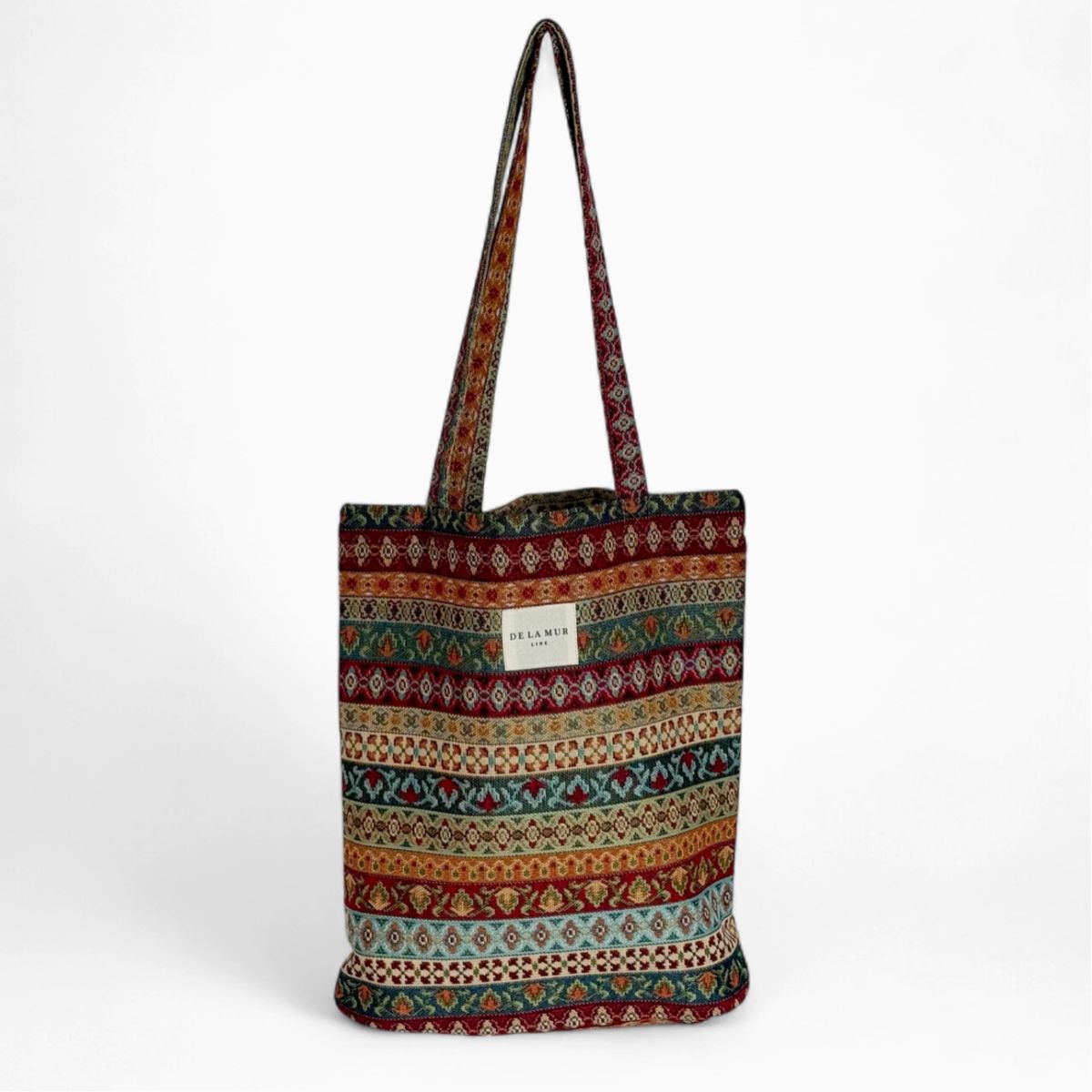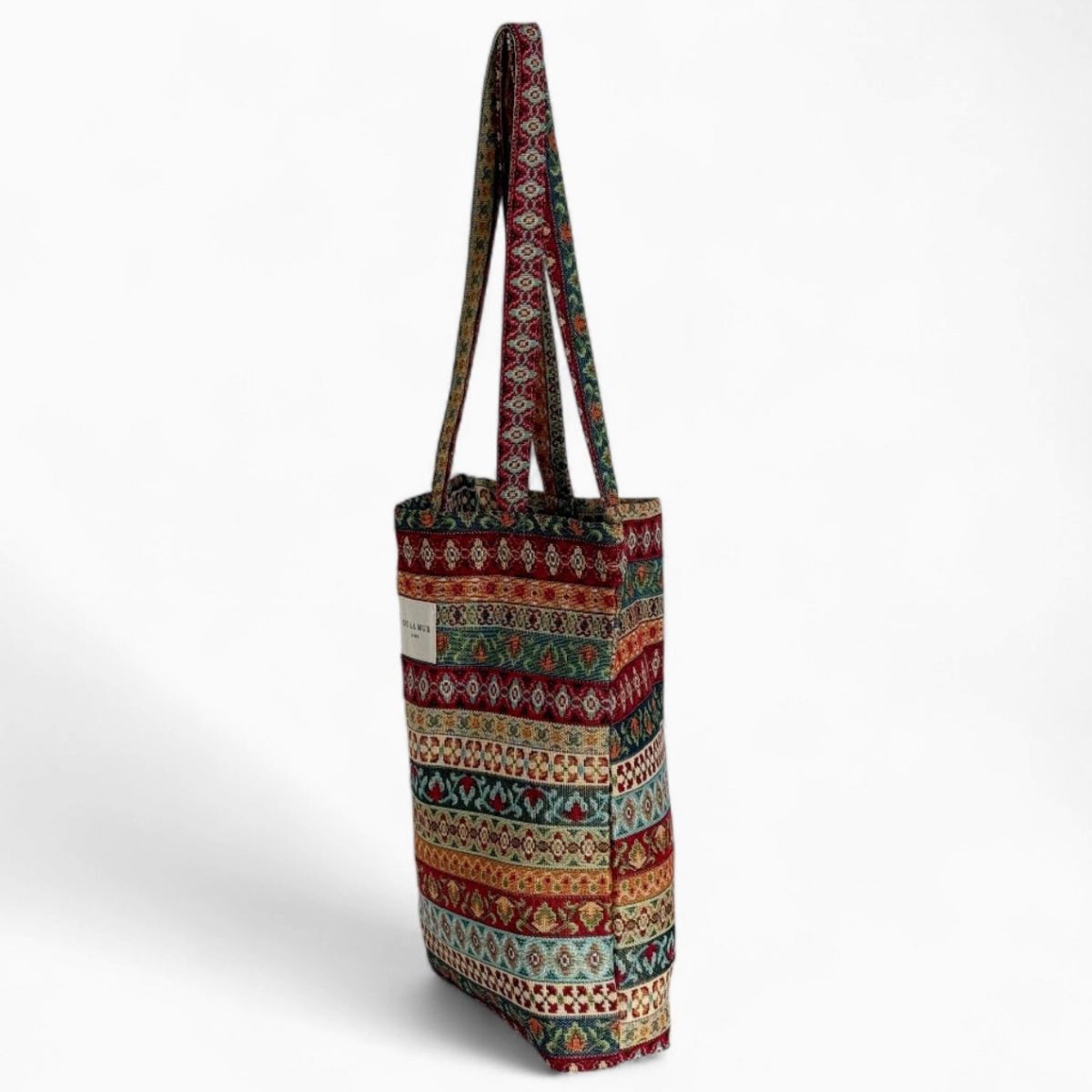 Realizzata in tessuto resistente di jacquard con stampa geometrica multicolore.