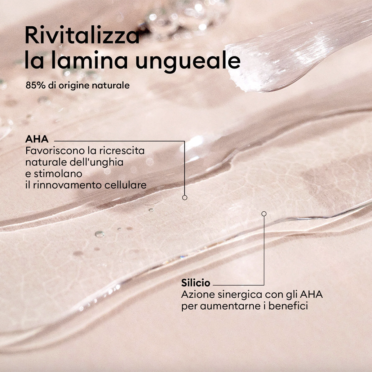 Questa base curativa per le unghie, bio-based al 85% e arricchita con AHA e PHA stimola il rinnovamento cellulare per favorire una ricrescita sana e veloce.