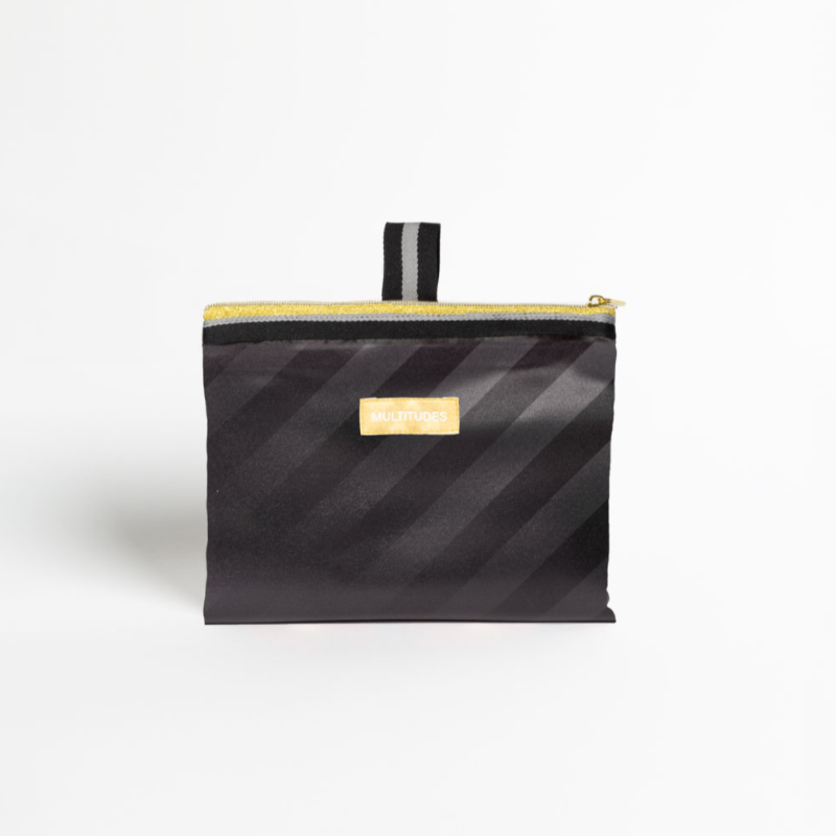 La pochette è realizzata con un tessuto effetto seta in 100% poliestere, con chiusura dorata a cerniera. Perfetta per trasportare le chiavi e altri piccoli oggetti da tenere al sicuro nella tua borsa oppure come custodia per riporre i tuoi accessori.