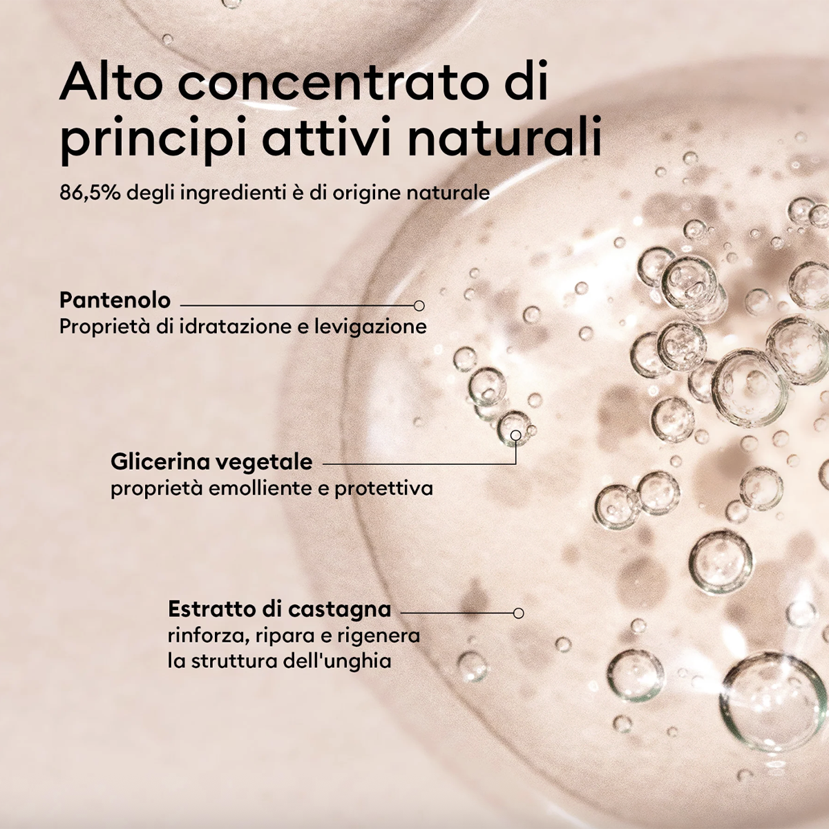 La sua formula esclusiva a base d'acqua e arricchita con glicerina vegetale, pantenolo ed estratti di castagna idrata e restaura in profondità le unghie rovinate, secche e che si spezzano, senza lasciare tracce oleose o appiccicose.